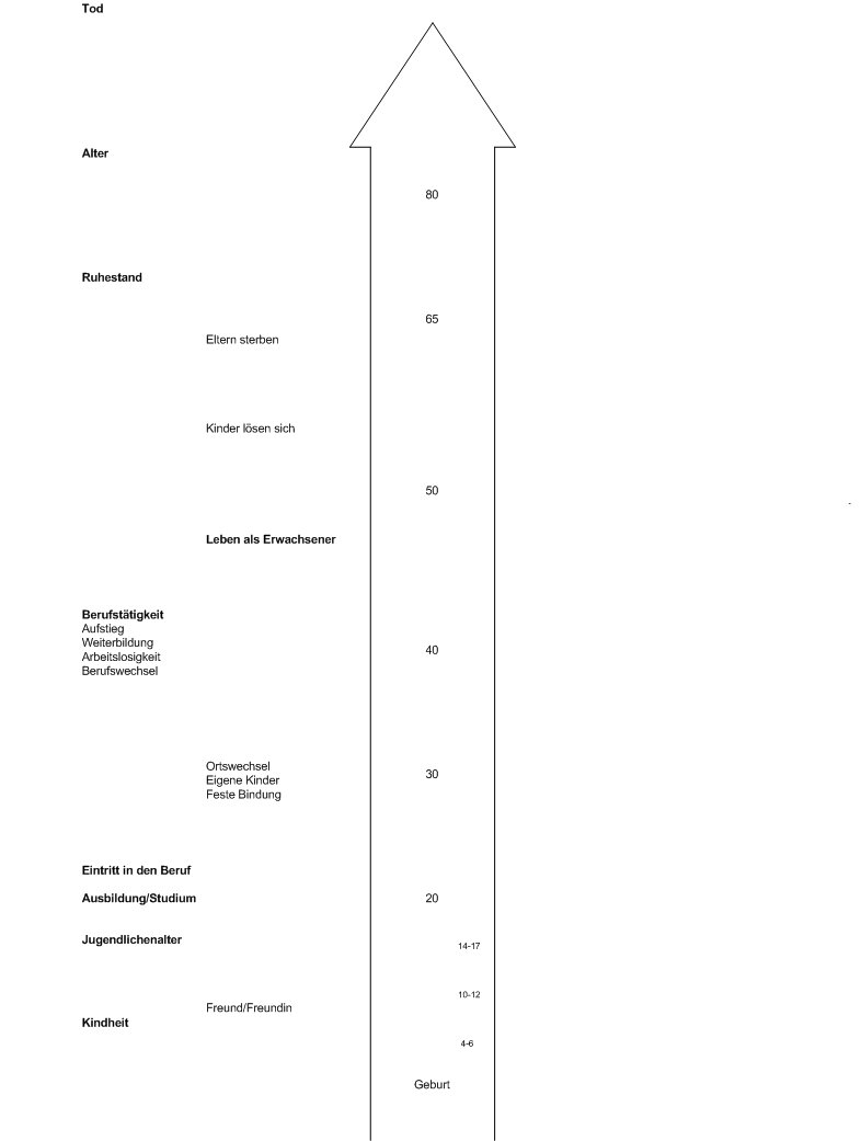 Auf einer Zeitachse wird der Zeitpunkt der Geburt eingezeichnet und ein Punkt des aktuellen Alters. Dazwischen sollen alle life events markiert werden, die für die Klientel bedeutsam erscheinen. Positive können oberhalb der Linie, negative unterhalb mit Jahres- und Monatsangabe und thematischer Benennung aufgetragen werden, möglicherweise farblich unterschieden.
